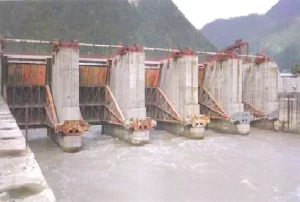 Concrete Diversion Dam : 5 bays of 13 M each having 4 M thick piers